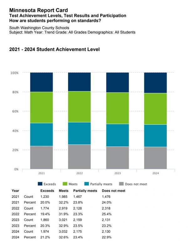 SoWashCounty School District 833 has only 21.2% students who exceed expectations in tests in 2024. From 2021 to 2024, students math test scores who have met standards have only increased by 0.4%.