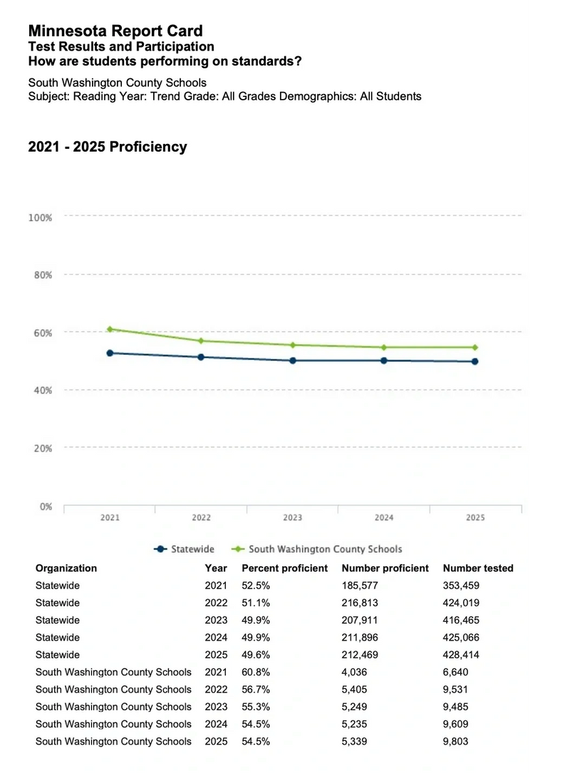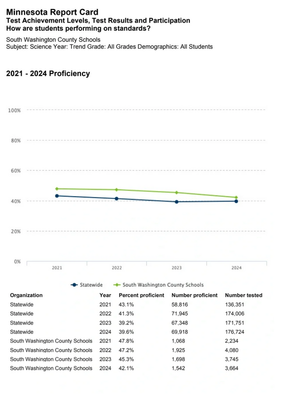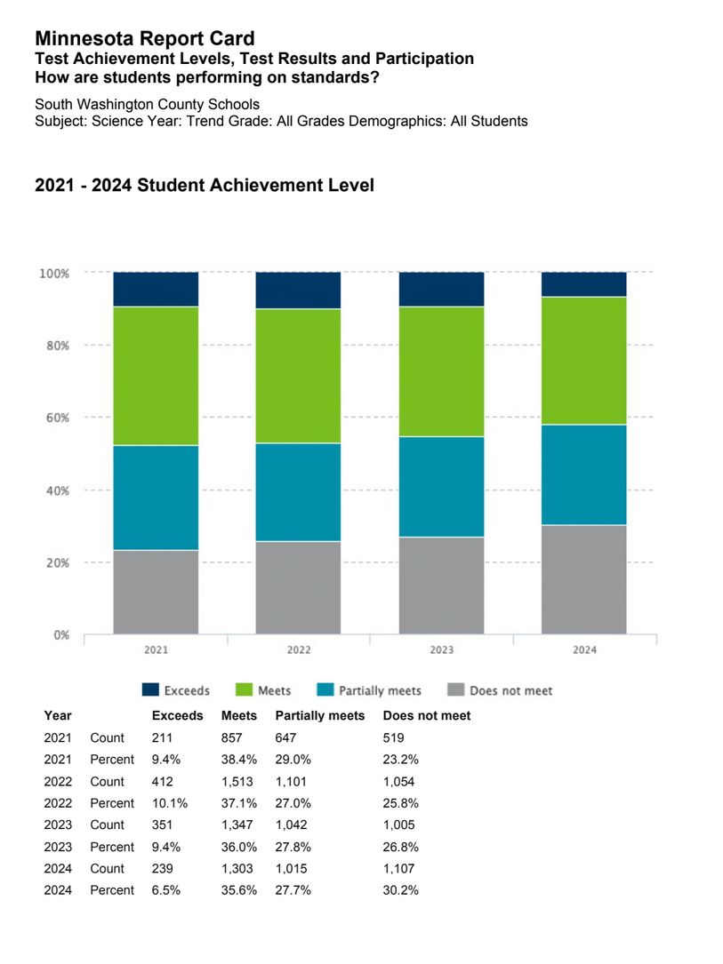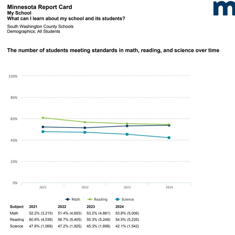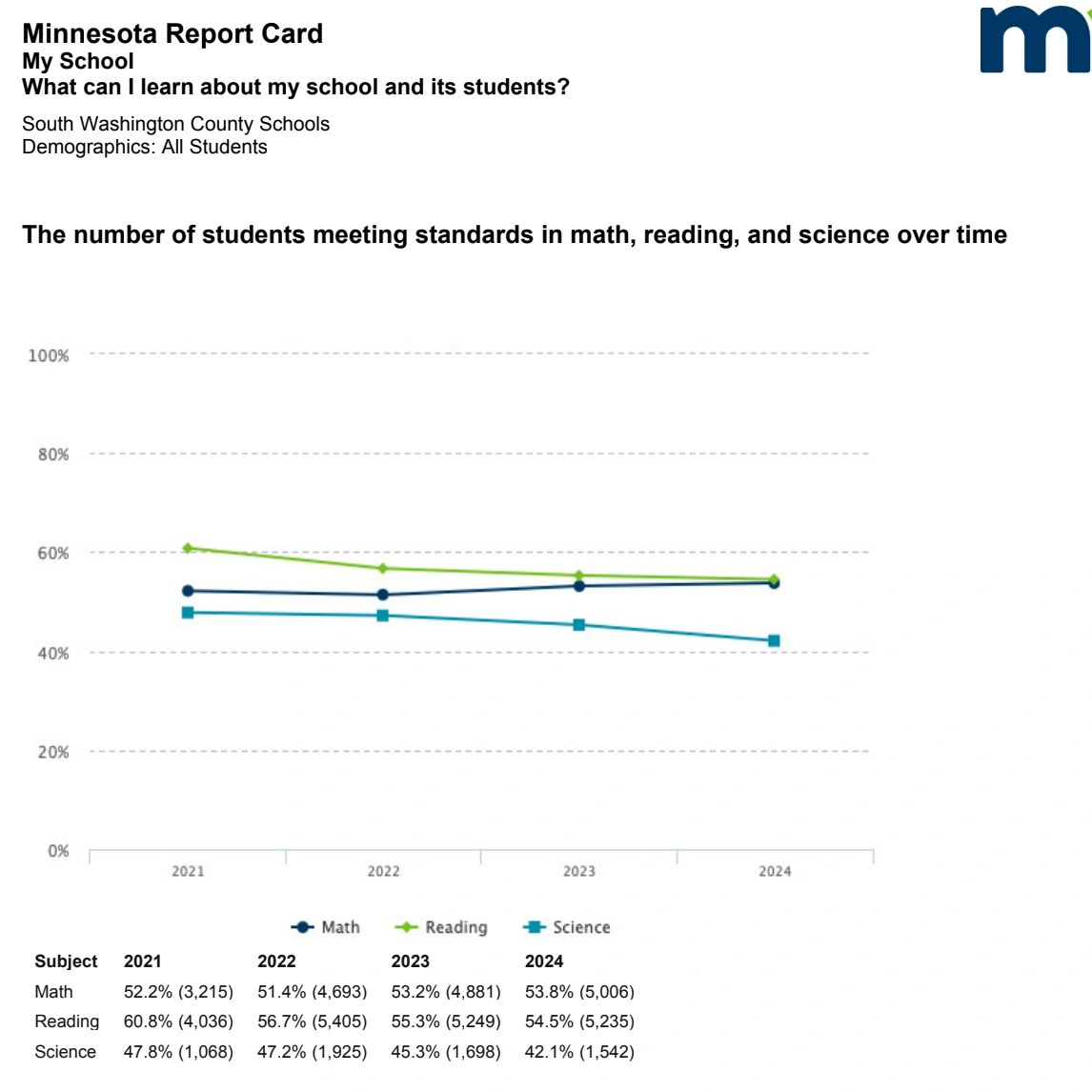 South Washington County School District 833 students are not meeting Minnesota State standards for reading, science and math.