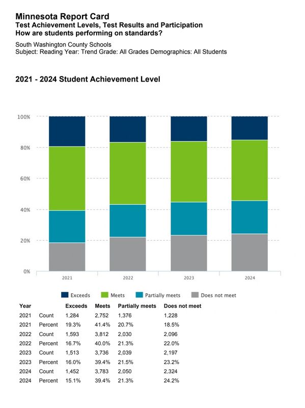 SoWashCounty School District 833 has only 15.1% students who exceed expectations in tests in 2024. From 2021 to 2024, students reading test scores who have met standards decreased by 2.0%. 2,324 students do not meet reading testing standards in 2024.